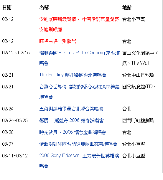 | --> 本頁主題: 【轉貼】藝人演唱會時間表 | 加為IE收藏 | 收藏主題 | 上一主題 | 下一主題 | 可列印版本 |