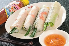 3.將九層塔、豆芽菜、薄荷葉、大陸妹(或廣東A菜)、 菜等,適量舖在米紙上,再放入米線和蝦子(一次放一隻即可),捲成春捲,沾魚露醬食用。
