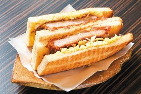一公分厚的豬排用水果、紅酒醃製六小時,在170度油溫炸5、6分鐘。方形土司烤到金黃,抹上雞蛋沙拉,夾進豬排、番茄、高麗菜即可。