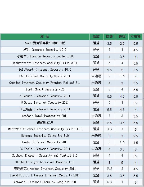 【資訊】AV-Test公佈2011年Q1殺毒軟件評測報告