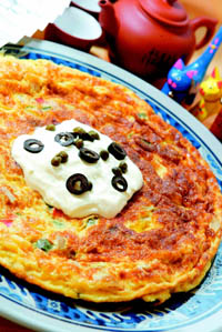 4.煎好之後,淋上一點酸奶油,灑上切碎的黑橄欖與酸豆即可。(淋上酸奶油的做法,是喜多見雅自創的錦上添花秘訣,讓烘蛋口感更清爽豐富。)