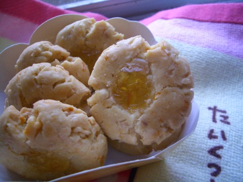 7.用小湯匙取適量柳橙果醬,填在麵糰凹處。用上火170度、下火150度烤約25分鐘,關火用餘溫悶10分鐘即可。