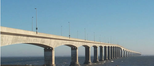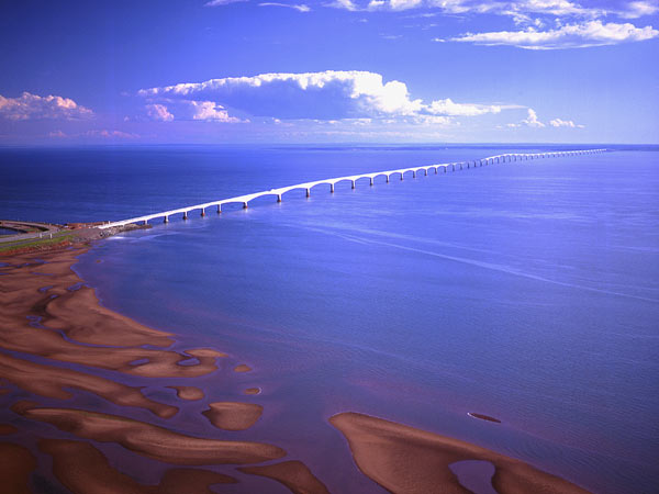 這座橋名為「聯邦大橋﹙Confederation Bridge﹚」,橋在加拿大,是連接愛德華王子島﹙Prince Edward Island﹚與新伯倫瑞克省﹙New Brunswick﹚之間的橋樑。