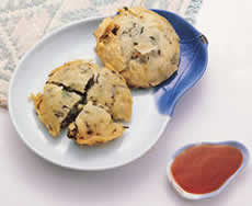 (2)煎杓塗點油,抹上一層粉漿,放上韭菜、加點蚵,再鋪上韭菜使成圓弧狀,最後再抹上一層粉漿,放入七分熱油鍋中,炸至金黃即可取出。