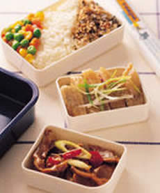 (3)雞肫洗淨後切片並用熱水川燙過,再放入調味料(3)一起煮沸使其入味,再將蔥、青蒜、辣椒切好與雞肫拌均勻,即可放入便當中。將綜合豆川燙後與調味料(4)拌勻備用。