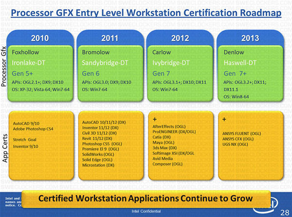 據國外媒體SoftPedia曝光的英特爾產品路線圖顯示,目前Sandy Bridge整合的是英特爾第6代圖形核心,支援DirectX 10.1和OpenGL 3.0;到了Ivy Bridge則進化至第7代,可支援DirectX 11和OpenGL 3.1;到了2013年,同為22nm但架構再度進化的Haswell處理器誕生,其將整合增強版的第7代英特爾圖形核心,可支援OpenGL 3.2和DirectX 11.1,而推薦使用的操作系統則是64位的Windows 8。另外,英特爾還在努力讓自己的圖形核心獲得各種專業圖形軟體的DirectX和OpenGL認證,目前Sandy Bridge已經獲得了AutoCAD 10/11/12、Photoshop CS5、Civil 3D 11/12等多款軟體的認可,隨後的Ivy Bridge和Haswell還會嘗試獲得3ds Max、Avid Media等專業軟體的認證。