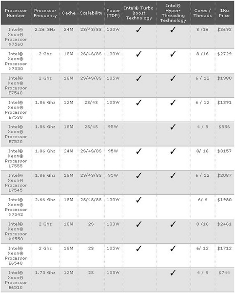 Intel在三月三十一號發佈了XEON 7500與XEON 6500系列 ,兩款皆採用Westmere核心製造,該系列為英特爾首款採用八核心設計的產品。 但是可惜的是採用了MCM的方式,而不是單晶片八核心設計。在 “英特爾超線程技術”(以下HTT)的允許下單顆處理器可獲得最多16個線程。