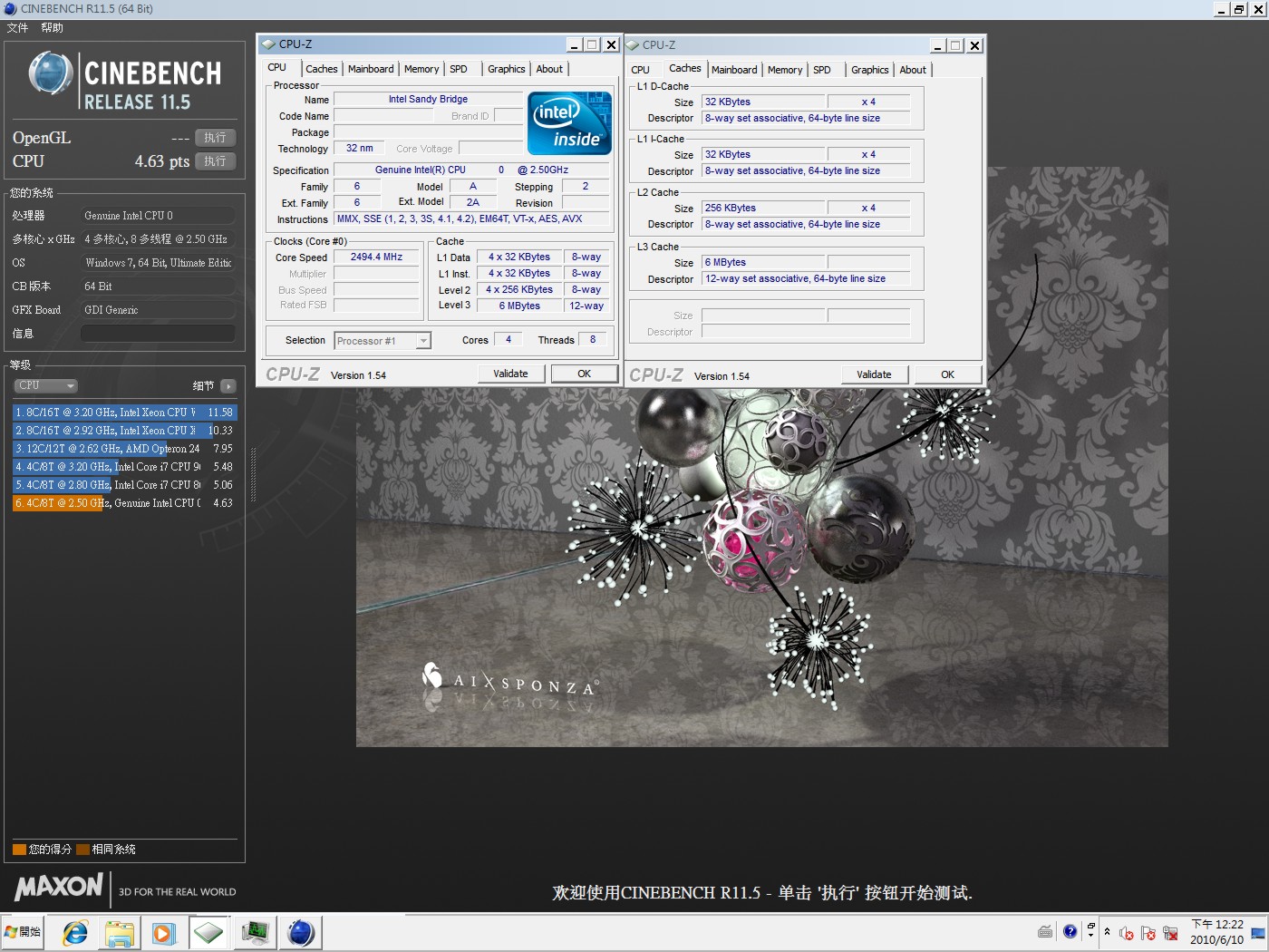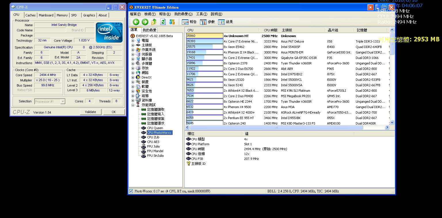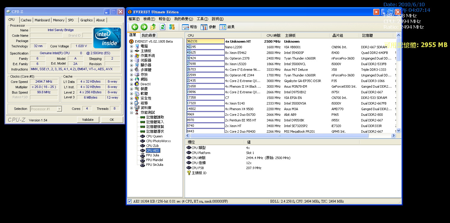 這顆Intel Sandy Bridge LGA 1155 處理器預設時脈為 2.5GHz ,4核心8線程,L3快取為6MB。CPU-Z 1.54版可以辨識出為Sandy Bridge,但細節規格仍然是空白。