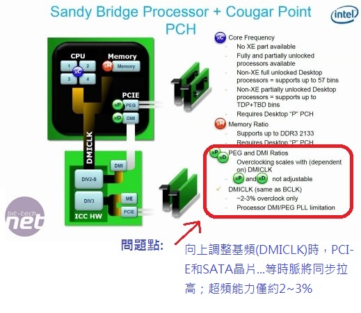 在1155平台上的P67的問題更是複雜,超頻時調整基頻(DMICLK),因整合的時脈產生器先天設計限制,會同步調整到PCI-E和SATA控制晶片...等等頻率,而衍生其他超頻問題。Intel說明了這是平台限制,而不是任何的設計問題;總之,明年會有不鎖頻的處理器來應對。